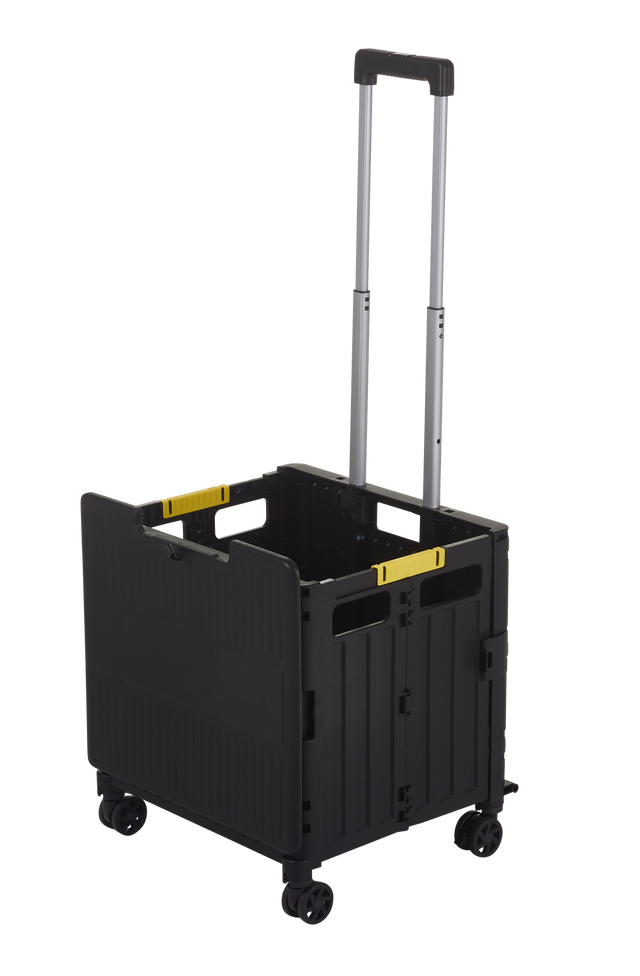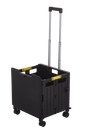 Durable folding box truck with swivel castors, tilt-handle and locking lid for flexible mobile storage and transport.