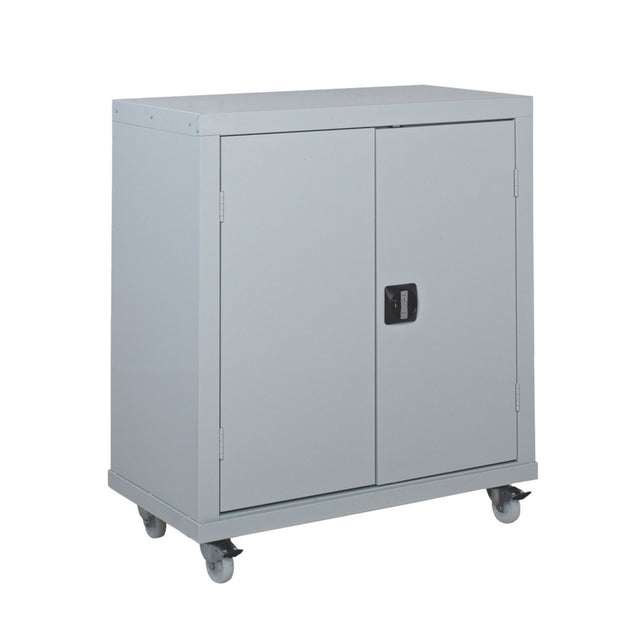 Strong workplace cupboard with no-snag handles, 2-point locking, strengthened doors, grey powder-coated carcass, Germ Guard antibacterial paint, EN 13501-1 fire reaction, pre-drilled mounting, 50 kg shelf capacity with 25 mm shelf adjustment.