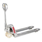 Heavy‑duty galvanised pallet truck conforming to EN 1757‑2, raised fork height 200 mm, lowered 85 mm, mobile on 200 × 50 mm nylon steering wheels & 80 × 70 mm nylon rollers - corrosion‑resistant for wet and damp conditions.