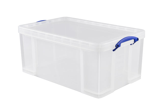 Large 64-litre clear storage box with lid and locking handles. Stackable and durable for commercial, industrial or home storage solutions.