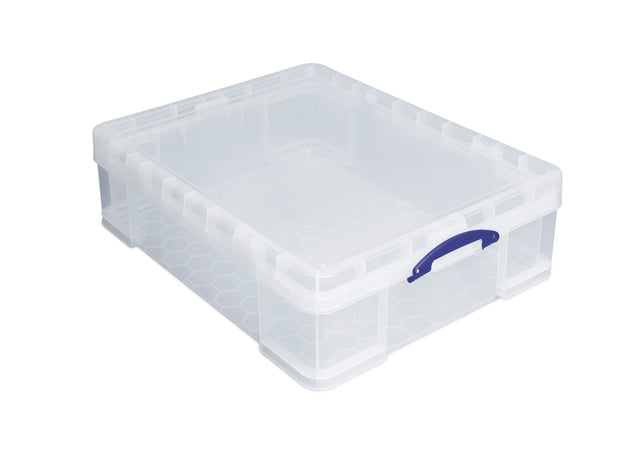 Heavy-duty 70-litre clear storage box with lid and locking handles. Perfect for warehouse, industrial or commercial use. Stackable for efficient storage.